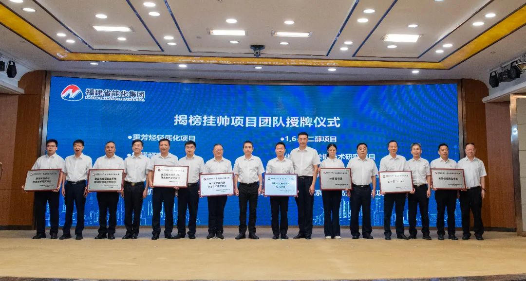 会议现场,集团领导为集团创新研究院成立以及“揭榜挂帅”项目团队授牌,并发布了能化集团科创产业基金和《科研项目管理办法》《科技创新奖励办法》。